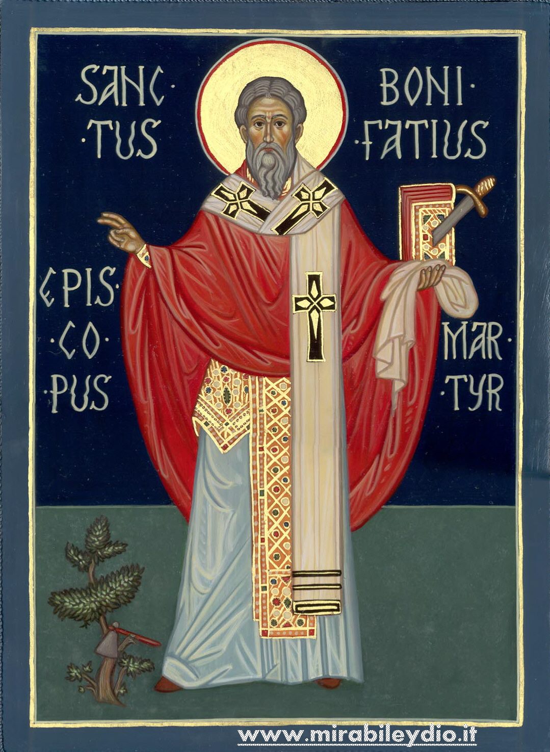 apostle of Germany & martyr Bonifacio o Winfrid sembra appartenesse a una nobile famiglia inglese del Devonshire, dove nacque nel 673 (o 680). Professò la regola monastica nell'abbazia di Exeter e di Nurslig, prima di dare inizio all'evangelizzazion e delle popolazioni germaniche oltre il Reno. Il suo primo tentativo di raggiungere la Frisia andò a vuoto per l'ostilità tra il duca tedesco Radbod e Carlo Martello. Winfrid compì allora il pellegrinaggio a Roma per pregare sulle tombe dei martiri e avere la benedizione del papa. S. Gregorio II ne assecondò lo slancio missionario e Winfrid ripartì per la Germania. Sostò nella Turingia, quindi raggiunse la Frisia, appena assoggettata dai Franchi, e vi operò le prime conversioni. In tre anni percorse gran parte del territorio germanico.