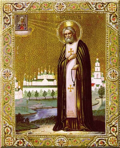 San Serafino di Sarov, monaco, è indubbiamente uno dei santi più popolari della Russia moderna, insieme con i martiri della famiglia imperiale Romanov. Al secolo Prohor Moshnin, nacque nella città di Kursk nel 1759 da una famiglia di mercanti. All’età di dieci anni si ammalò gravemente e durante il periodo di malattia ebbe una visione della Madre di Dio, che gli promise la guarigione. Alcuni giorni dopo, la miracolosa icona della Madre di Dio di Kursk venne portata in processione per le strade della città, ma a causa del maltempo la processione fu accorciata e deviata nei pressi della casa natale di Prohor. La mamma avvicinò il piccolo all’icona e questi guarì in poco tempo. Sin dalla più giovane età Prohor amava frequentare la Chiesa, ritirarsi in preghiera e leggere le biografie dei santi.